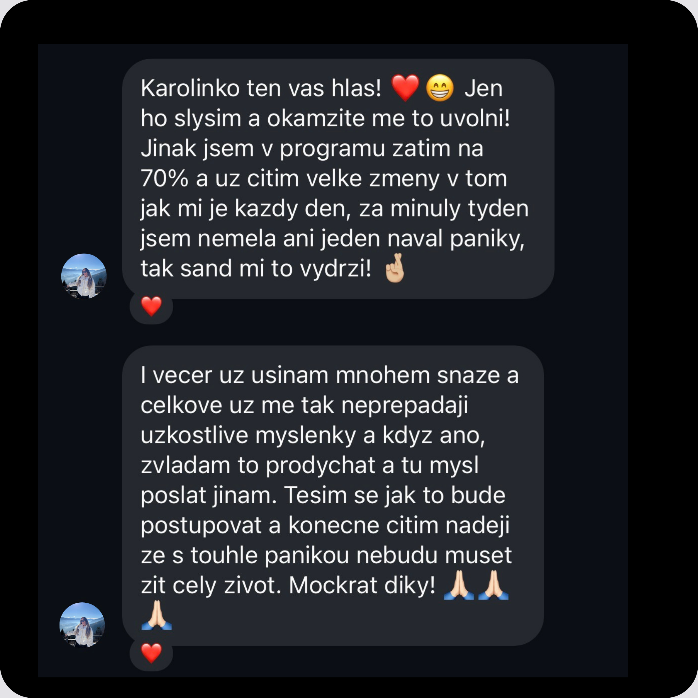 Teď mnohem lépe usínám, dokážu mnohem klidněji zvládat stresové situace a už necítím tak silné úzkosti jako dřív. Když je toho na mě někdy moc, nemám už ty panické reakce jako dřív a dokážu se rychleji vrátit zpět do klidu.