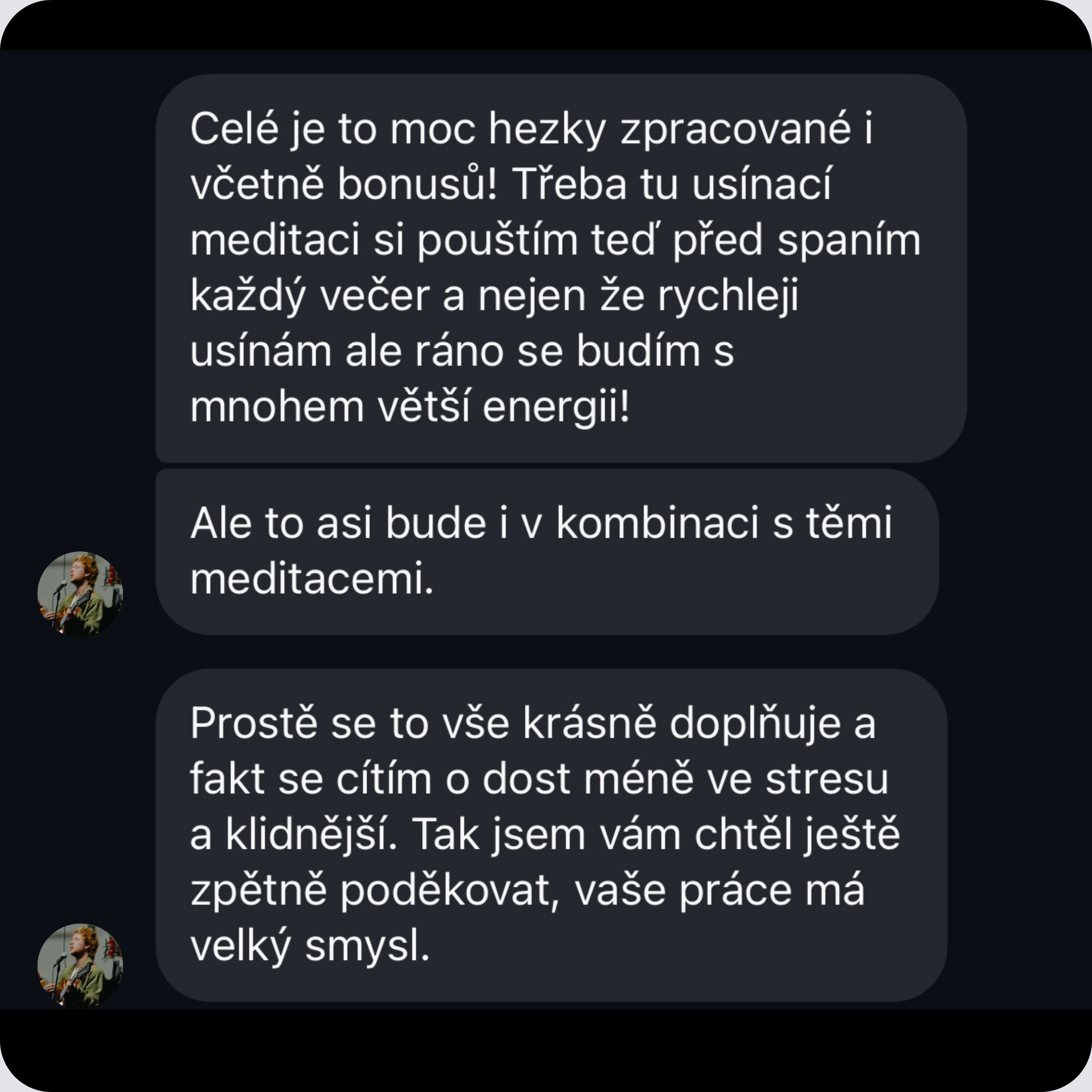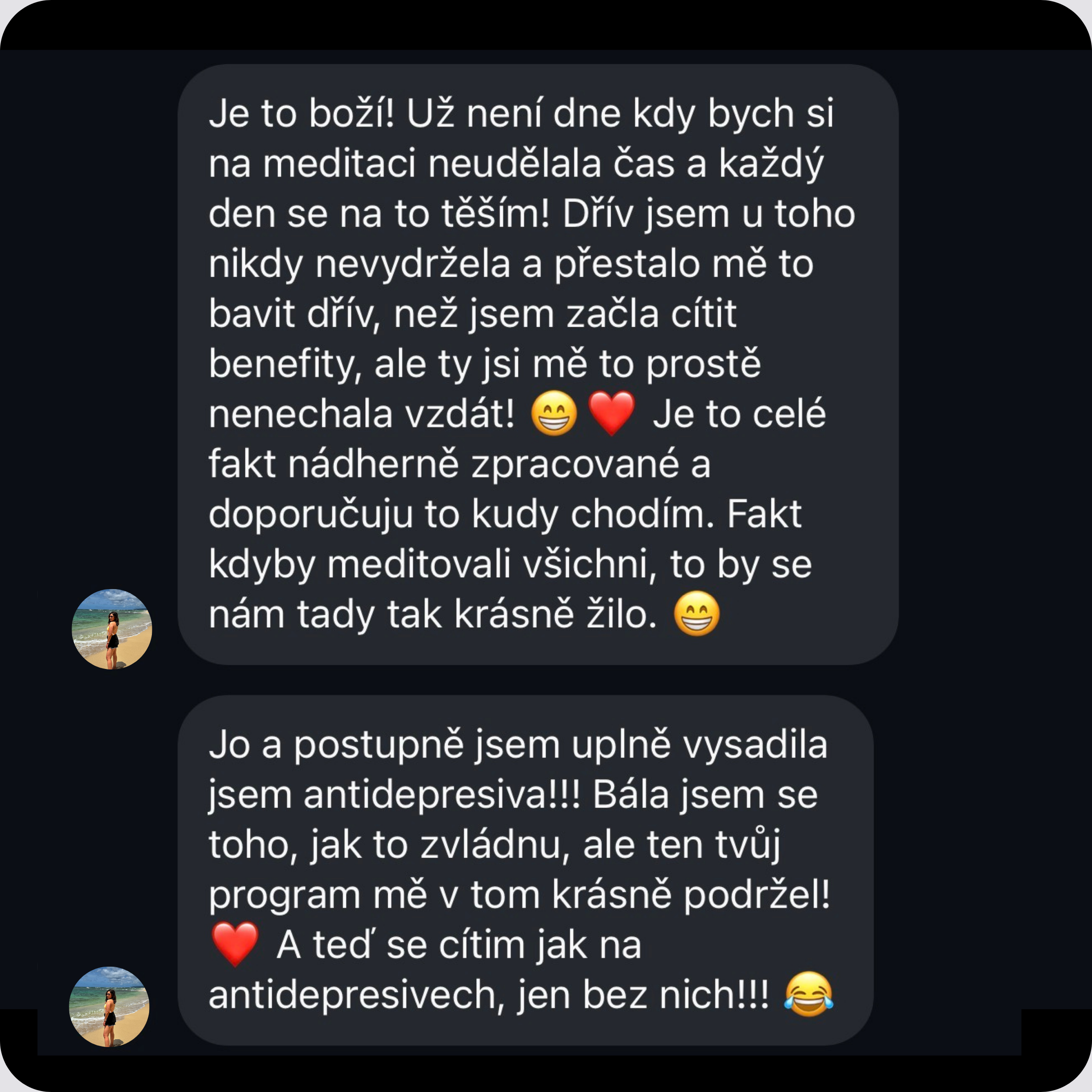 „Jsem úplně nadšená z toho, jak je celý program zpracovaný. Všechno je velmi srozumitelné, postupné a dává to smysl. A navíc miluji Káji hlas – je tak uklidňující, že se mi při meditacích opravdu daří vypnout.